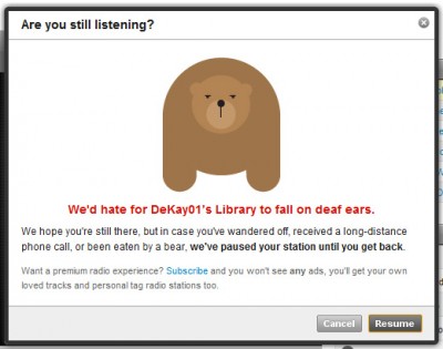 Today, I was pleased to see that online music “experience” and music streaming service Last.fm were doing their bit for carbon dioxide emissions and bandwidth reduction by pausing the radio if they detected I may have been eaten by a bear.