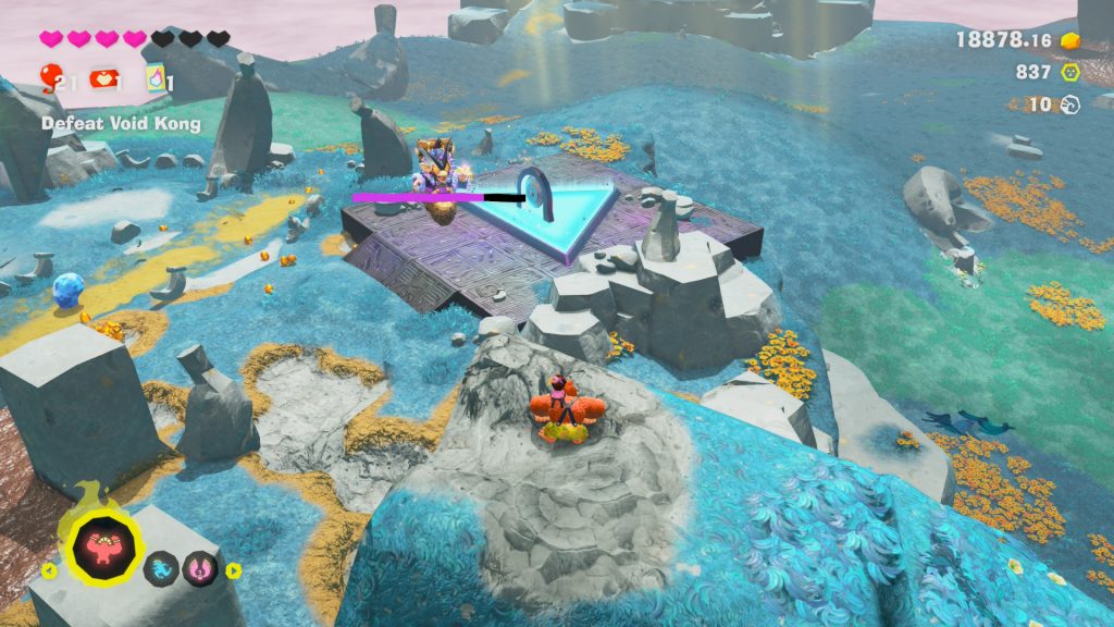 The gameplay is great though. Punching through everything is actually pretty addictive, even if the rewards for doing so are minimal. You very quickly rack up more gold – the main currency in the game – than you can ever spend. Other things you find, like bananas and fossils are of more use but are rarer. Once you get the upgrade which lets you see where various treasures are buried, it lets you focus on the important stuff so you don’t randomly punch everywhere. Except, of course, I did anyway. Enemies are mostly dispatched by either punching them, or throwing stuff at them (you can rip up chunks of ground to do this) but some are unfazed by “softer” material or need a specific type of rock to expose their weak points first, so there’s sometimes some strategy to the combat rather than button mashing.