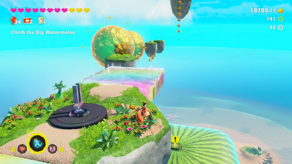 Levels are varied, with many reminding me of bits of Mario 64. There’s loads to do, with each huge area (or layer, as the game calls them – you’re slowly digging down to the planet’s core) already full of missions, quests or jobs to do and then having a number of, mostly hidden, challenge doors that include tricky platforming, puzzles, and taking on enemies in a range of environments. You also gain skills, mainly in the form of animal transformations, which can let you reach previously inaccessible areas within levels you’ve already done, so it’s a bit Metroidvania-y in that way. Minor upgrades in the form of purchasable clothing are also available, to buff your attacks, elemental defences, and give you more time in your transformed states.