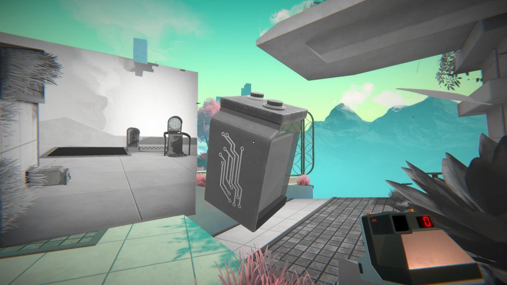What it actually is, because that’s just the framing gimmick, is a series of first person levels where the aim is to reach a device that lets you move on to the next bit. Only it’s always out of reach or needs power or is behind a wall or has a missing cable or is sound activated but the sound-making-device is too far away.