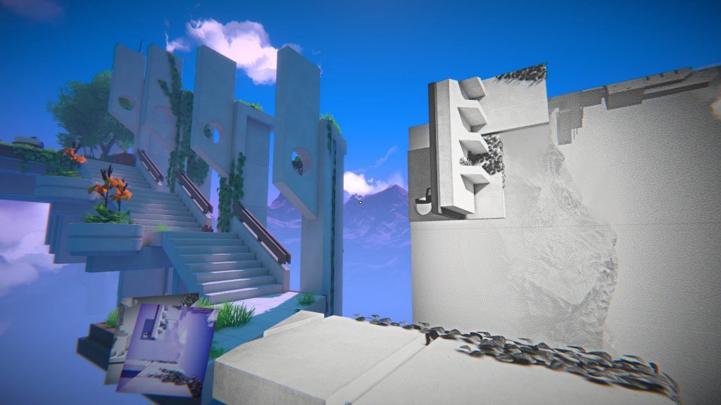 You solve these puzzles initially by making use of photographs you find. These 2D pictures create a 3D object of the photo when used, so for example, you have to get from one platform to another but there’s a big gap. If you stand in the right place, and hold up the photo of a bridge you found nearby in just the right way that it looks like the bridge fills the gap, then magically it does fill the gap.