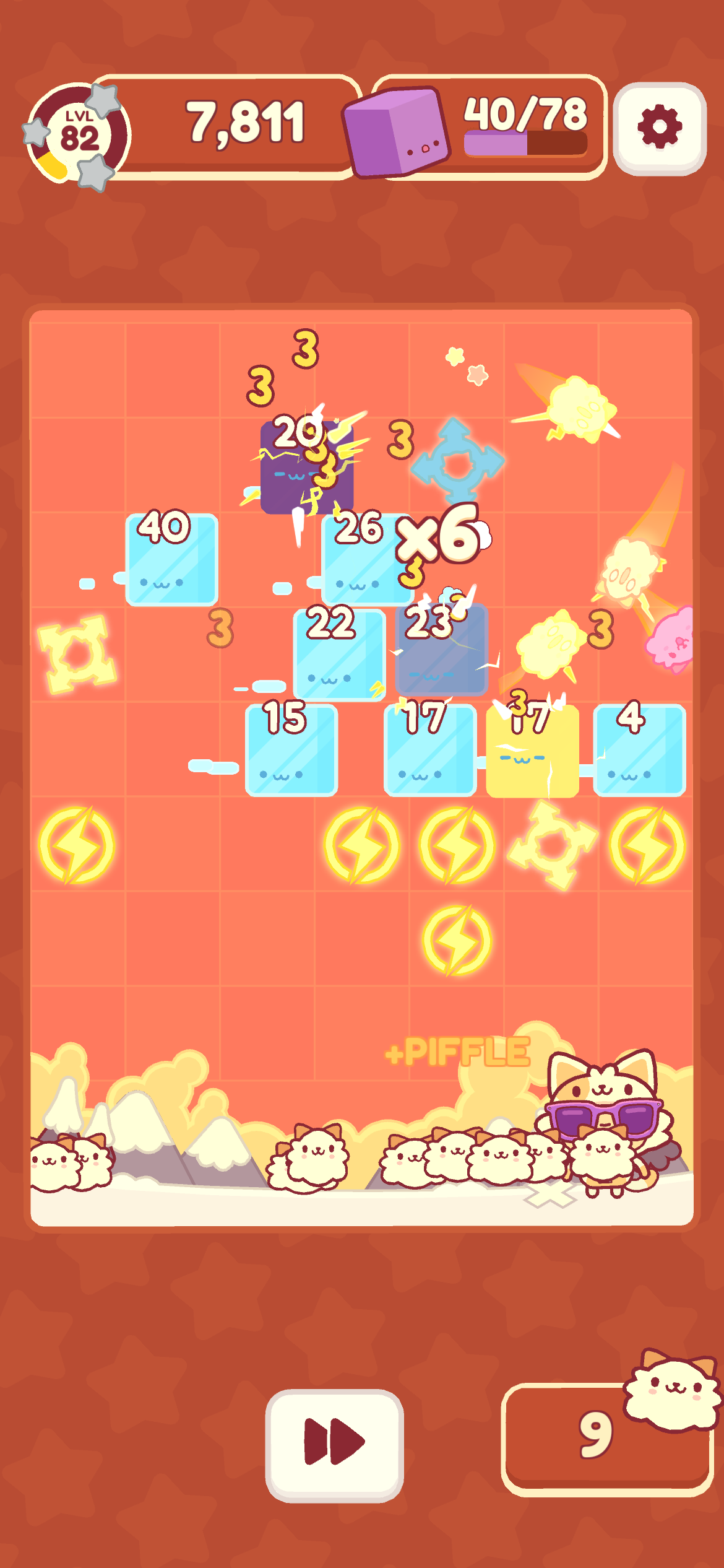 Piffle, or more accurately, Piffle+ (it’s a free IAP-less Apple Arcade version of an IAP’d game), is a simple arcade puzzle-ish game that is a bit Breakout and a bit Peggle. You throw balls (which are cat heads) upwards at blocks, destroy as many as you can, and then they all move down a row before you have another go.