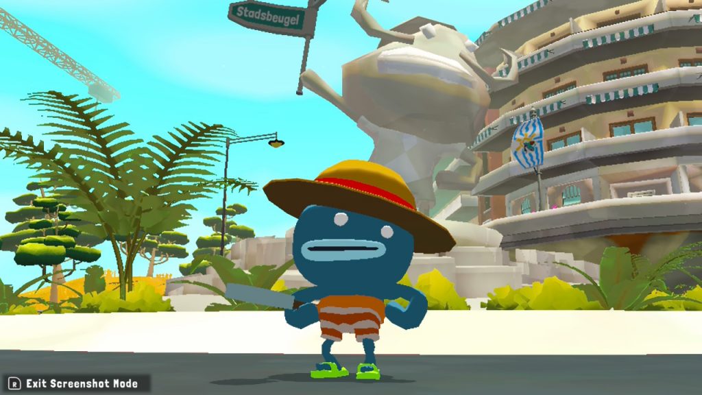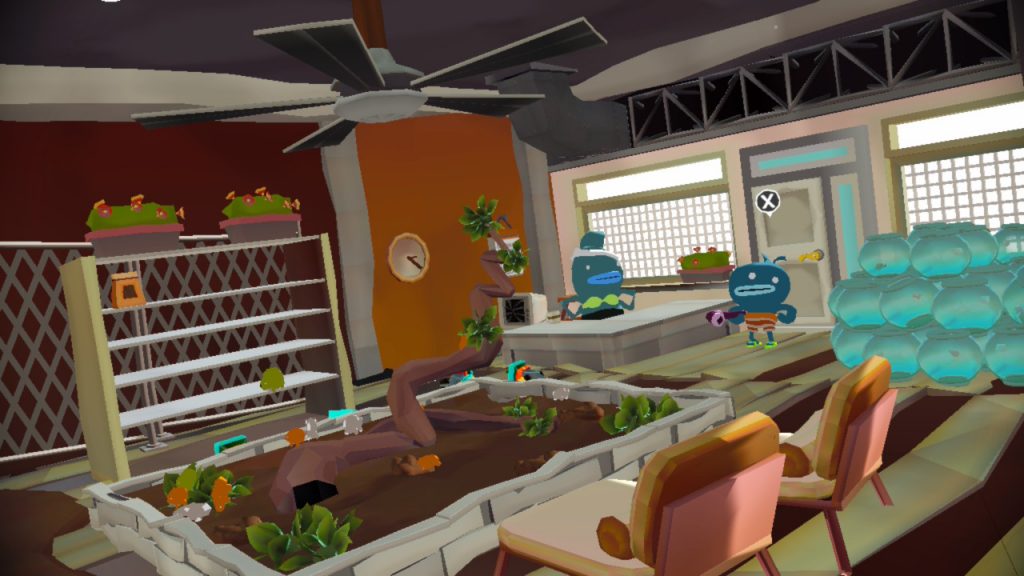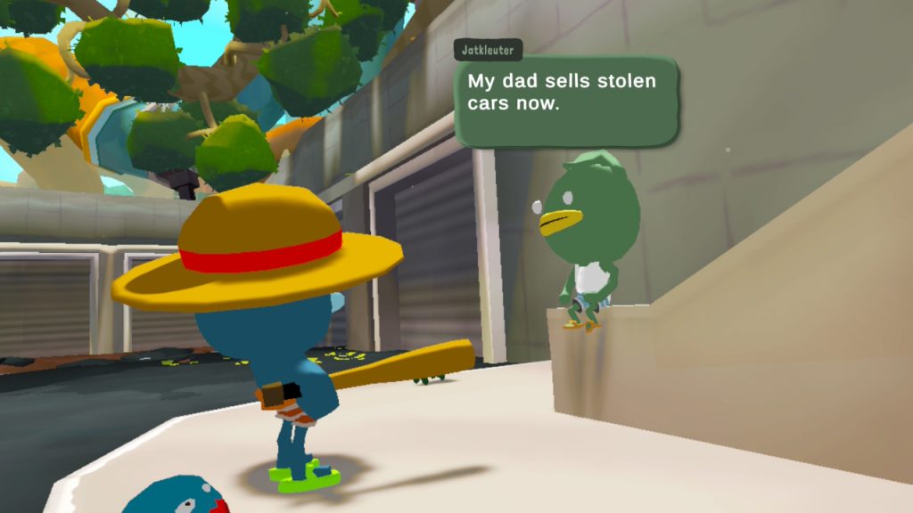 It plays out as an open world game where you collect items of rubbish that you can spend on car upgrades, and find money to buy items, weapons and so on. There are missions where you have to find stuff or go places, and loads of weird characters to meet. Like the guy who is clearly burning alive on the beach but refuses to listen to you saying he’s fine until you return later to find his charred remains and nick his sunglasses. For the guy in a back alley who wants you to help him do crimes, but not really bad crimes, just middling crimes. Or the kid who fences stolen cars. Or the fast food seller who is legally bound to give you “beach fries” for free whenever you ask, which you then take home to feed your fish with. It’s all very silly.