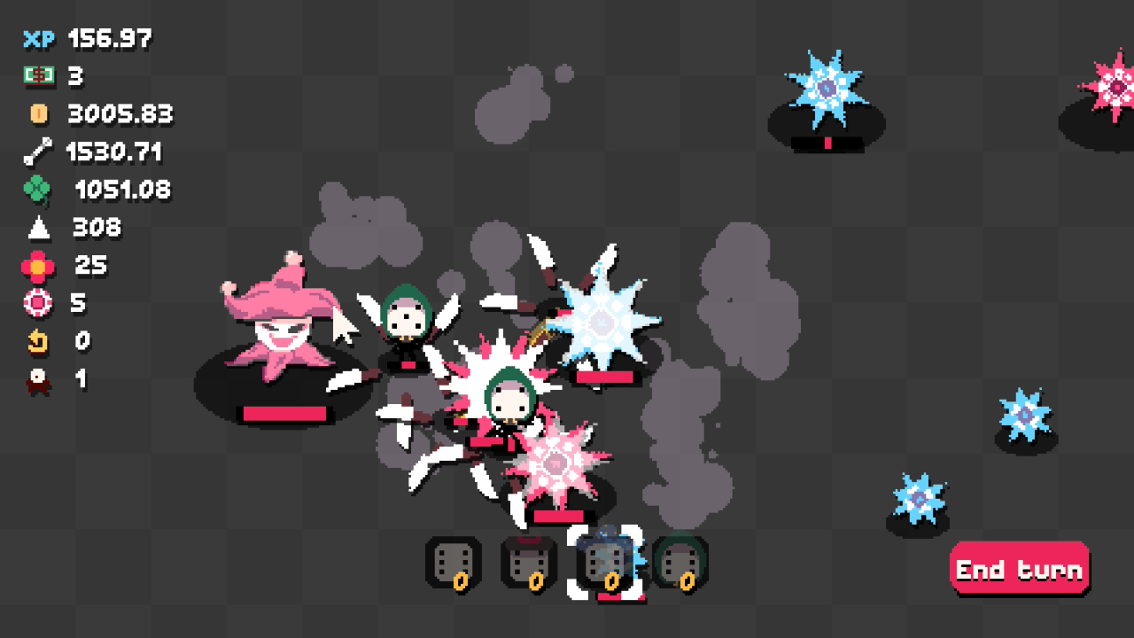 You use the money to buy more dice people, and the items to unlock millions of things on the skill tree. Or rather, Massive Skill Grid. You can increase probabilities, strength, obtained item quantities, and so on here, making the next round a bit easier. Eventually you unlock enough and progress far enough to take on a boss, after which you’ve completed the game.