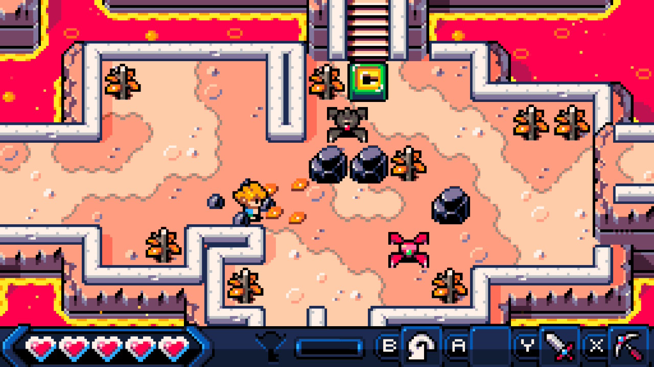 Once completed, however, you get access to a roguelike dungeon mode, where you have 50 small rooms with increasingly difficult baddies and traps to get past, with random upgrades every time you’ve collected enough XP. A run here will be maybe 45 minutes or so, and it’s great. I completed this too, but it did take about 10 or 12 runs to do so. Tip: the seemingly useless pickaxe upgrades should not be ignored (like I kept doing) as they make the final boss much easier.